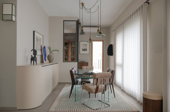 Le travail des luminaires, graphiques et légers, ainsi que les jeux de lignes et de transparence, permettent de structurer les volumes tout en conservant une certaine fluidité.